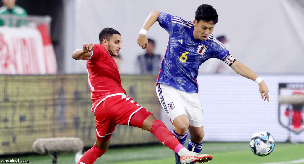 صورة التقطت أمس للياباني واتارو إندو يحاول المرور بالكرة وسط مضايقةٍ من التونسي ألياس أشوري (الفرنسية)