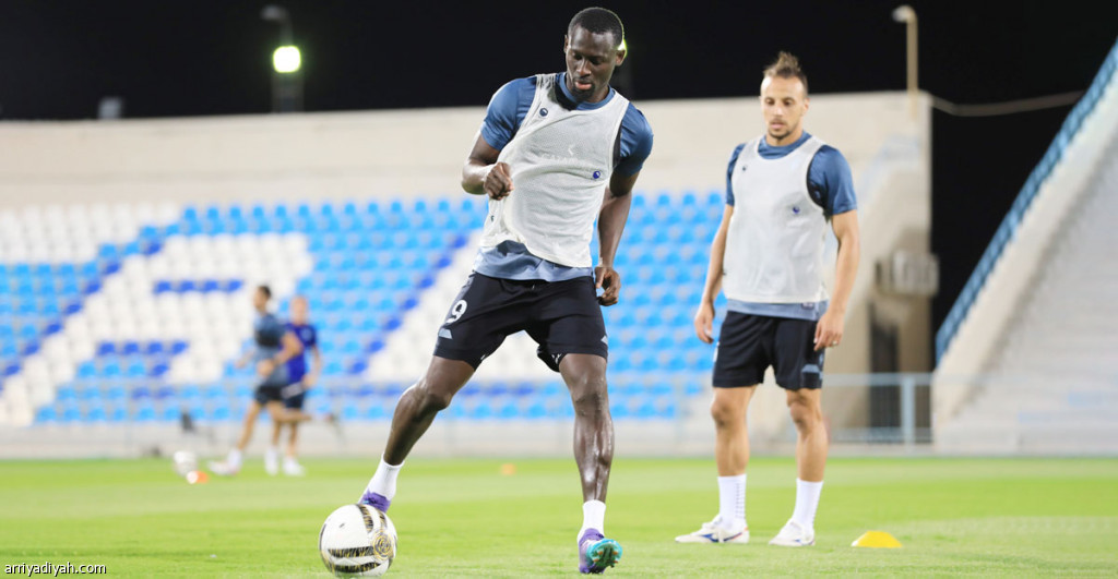 صورة التقطت أمس للإيفواري مامادو سورو، مهاجم فريق الباطن الأول لكرة القدم، يمرر الكرة خلال التدريبات وخلفه زميله المغربي زكريا الهلالي (المركز الإعلامي ـ الباطن)