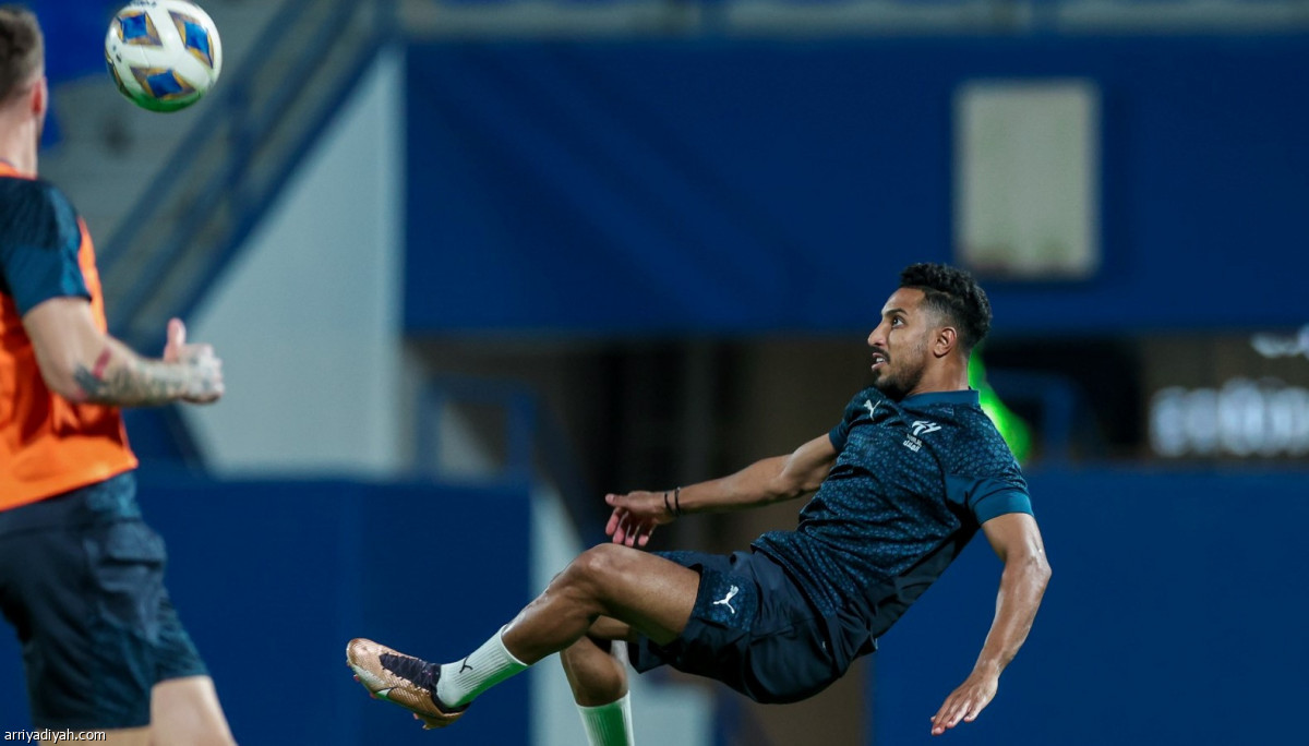 سالم الدوسري لاعب فريق الهلال الأول لكرة القدم، في لعبة هوائية خلال الحصة التدريبية الختامية للفريق استعدادًا لمواجهة موباي الهندي في دوري أبطال آسيا ( الهلال - المركز الإعلامي)