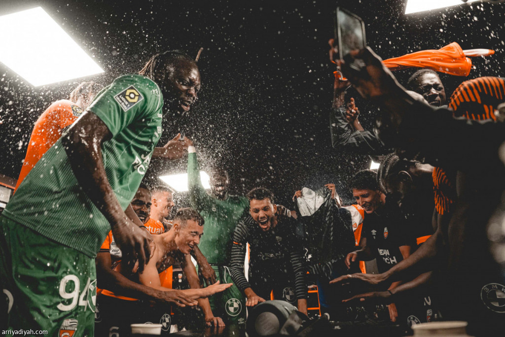 صورة التقطت أمس للاعبي فريق لوريان الأول لكرة القدم يحتفلون بالفوز بعد المباراة(الأوروبية)