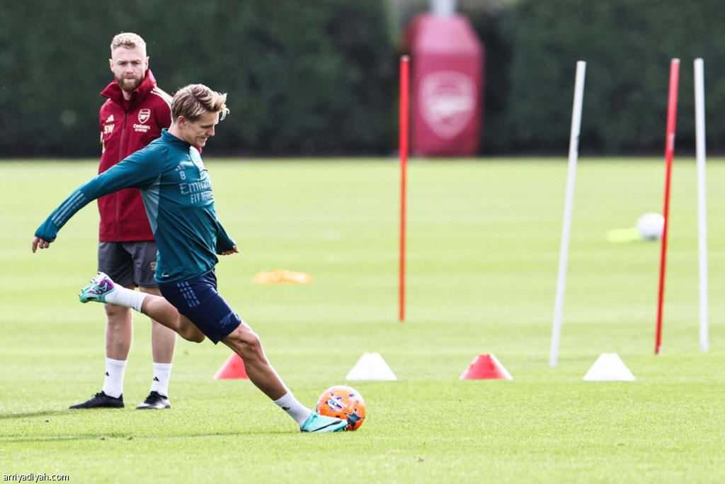 صورة التقطت أمس للنرويجي مارتن أوديجارد، قائد فريق أرسنال الأول لكرة القدم، يسدد الكرة خلال الحصة التدريبية قبل مواجهة إشبيلية اليوم في دوري أبطال أوروبا.. ا(الفرنسية) و(رويترز)