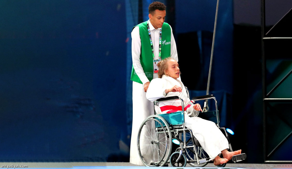 صورة التقطت أمس لمتطوعٍ خلال مساعدته إحدى المشاركات عبر دفع كرسيها المتحرِّك ضمن منافسات دورة الألعاب القتالية (المركز الإعلامي ـ دورة الألعاب القتالية)