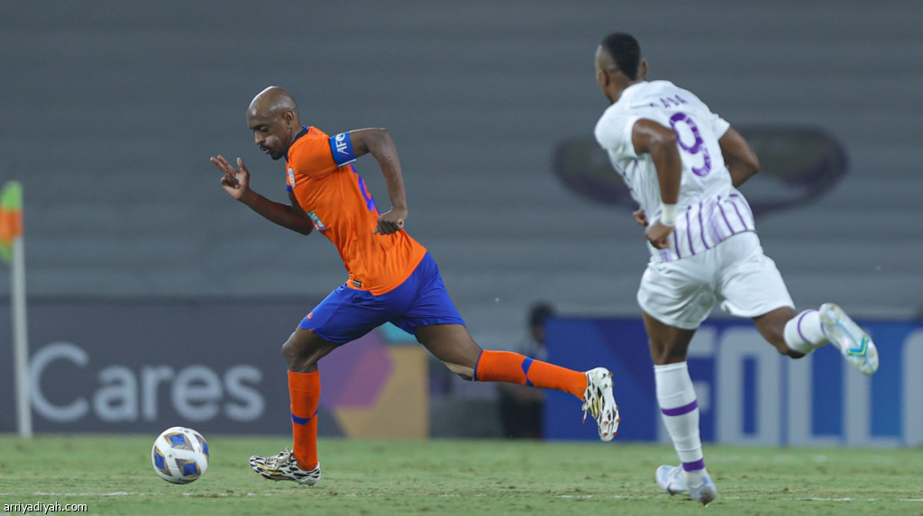 سامي الخيبري قائد الفيحاء خلال مروره من أمام لابا كودوجو لاعب العين الإماراتي خلال اللقاء الذي جمعهما ضمن منافسات دوري أبطال آسيا ( المركز الإعلامي - الفيحاء)