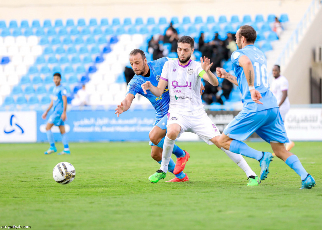 صورة التقطت أمس للهولندي هشام فايق لاعب وسط فريق البكيرية يحاول المرور من مدافعي الباطن (المركز الإعلامي ـ رابطة الدوري)