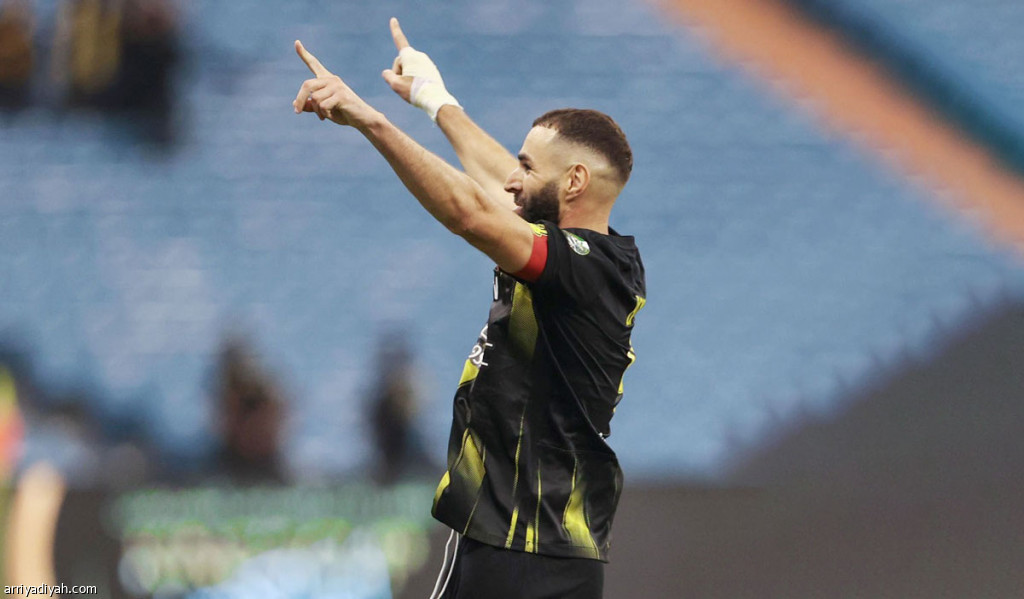 صورة التقطت أمس للفرنسي كريم بنزيما يحتفل عقب تسجيله الهدف الثالث (المركز الإعلامي - الاتحاد)