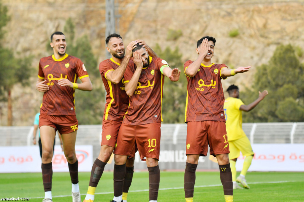 صورة التقطت أمس للجزائري رياض بودبوز لاعب أحد يحتفل برفقة زملائه بعد تسجيل الهدف الثاني في مرمى العين(المركز الإعلامي ـ رابطة الدوري)