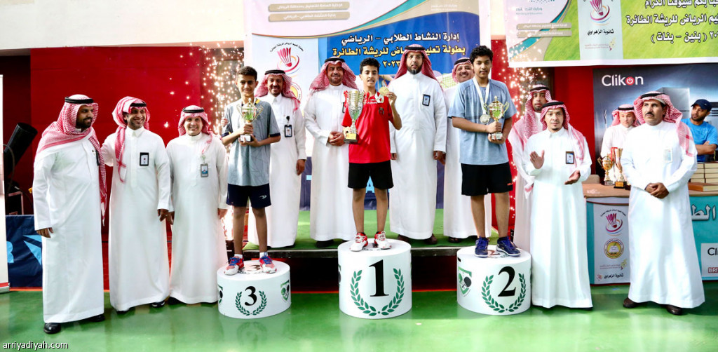صورة التقطت أمس لمحمد آل حسين أثناء تتويج أصحاب المراكز الأولى في بطولة تعليم الرياض للريشة الطائرة (المركز الإعلامي ـ تعليم الرياض)