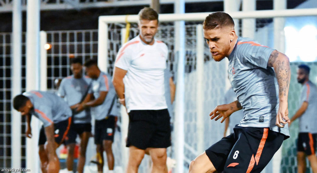 صورة التقطت في 24 أكتوبر الماضي للكولومبي جوستافو كويلار، لاعب وسط الشباب، يمرر الكرة خلال حصة تدريبية وسط متابعة المدرب الكرواتي إيجور بيسكان (المركز الإعلامي ـ الشباب)