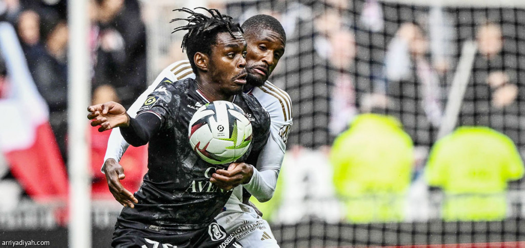 صورة التقطت أمس للسويدي جويل أسورو، مهاجم ميتز، والأنجولي كلينتون ماتا، لاعب ليون، يتصارعان على الكرة (الفرنسية)