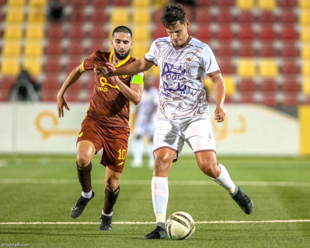 صورة التقطت أمس للبرازيلي نيلسون، لاعب الجبلين، يحاول تمرير الكرة وسط مضايقة من الجزائري رياض بودبوز لاعب أحد (المركز الإعلامي ـ دوري يلو)