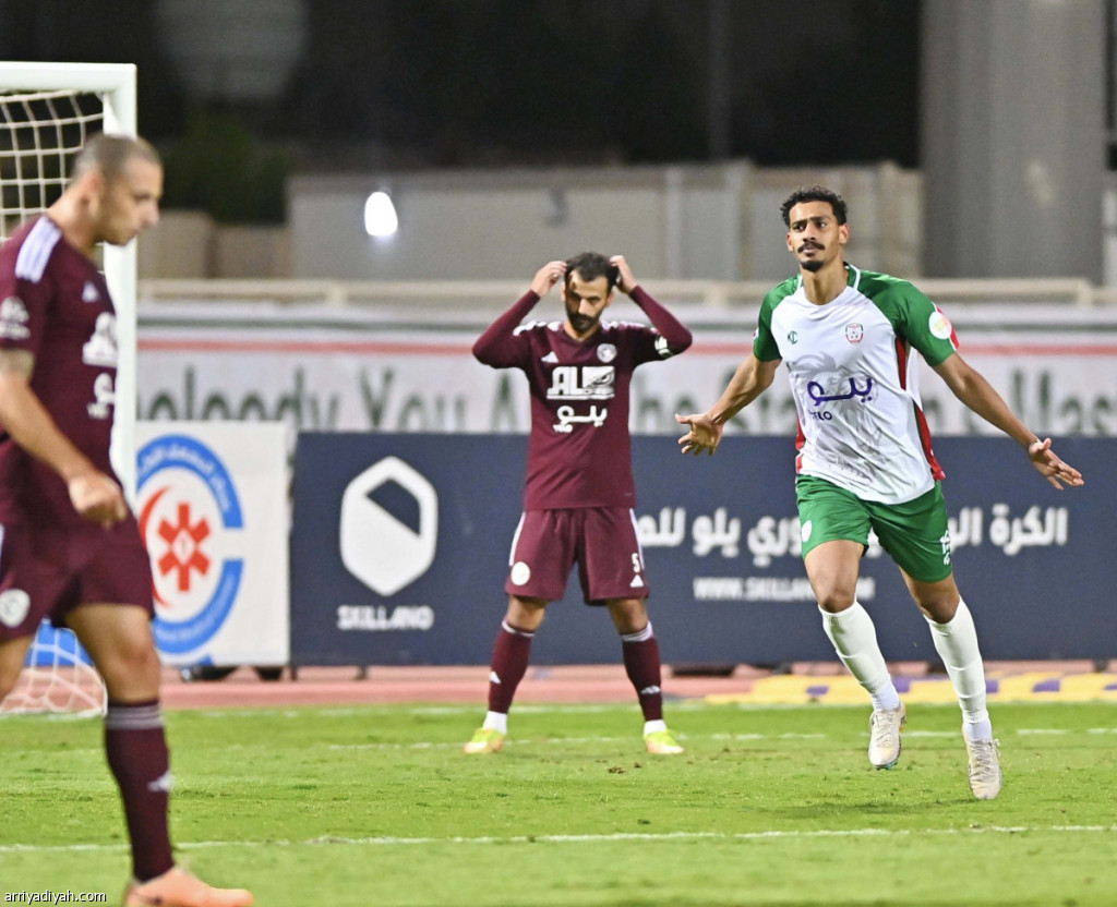صورة التقطت أمس لمازن السويلم، مهاجم الخلود، يحتفل بعد تسجيله الهدف وسط حسرة من محمد العمري مدافع الفيصلي(المركز الإعلامي ـ دوري يلو)