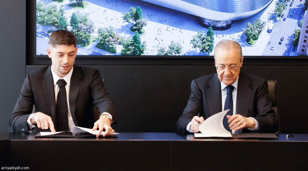 صورة التقطت أمس لفلورينتينو بيريز، رئيس نادي ريال مدريد، وفيديريكو فالفيردي، لاعب الوسط، خلال التوقيع على تمديد العقد (المركز الإعلامي ـ ريال مدريد)