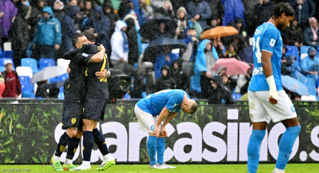 صورة التقطت أمس للاعبين من فريق إمبولي الأول لكرة القدم يحتفلون بالفوز على نابولي وسط حسرة من لاعبي نابولي(الأوروبية)