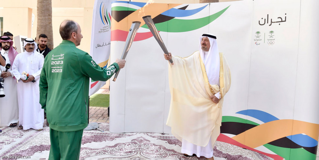 صورة التقطت أمس لجلوي بن عبد العزيز، أمير نجران، يتسلم شعلة الألعاب السعودية(واس)
