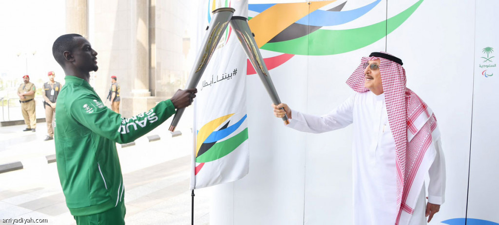 صورة التقطت أمس لمحمد بن ناصر، أمير جازان، يتسلم الشعلة من طارق حامدي البطل الأولمبي (واس)