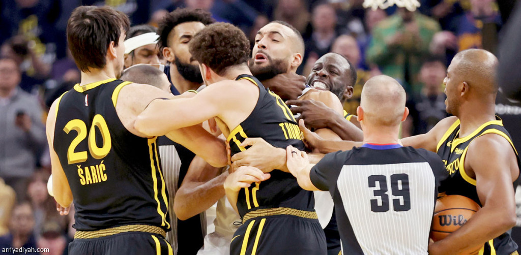 صورة التقطت أمس لدرايموند جرين يمسك برقبة الفرنسي رودي جوبير وسط تجمع من لاعبي الفريقين (أسوشيتد برس)