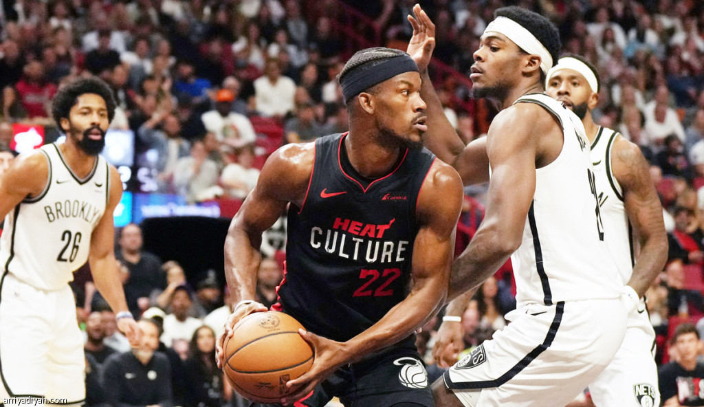 صورة التقطت أمس لجيمي باتلر لاعب ميامي هيت يحاول المرور من لاعب بروكلين في مواجهة الفريقين (الفرنسية)
