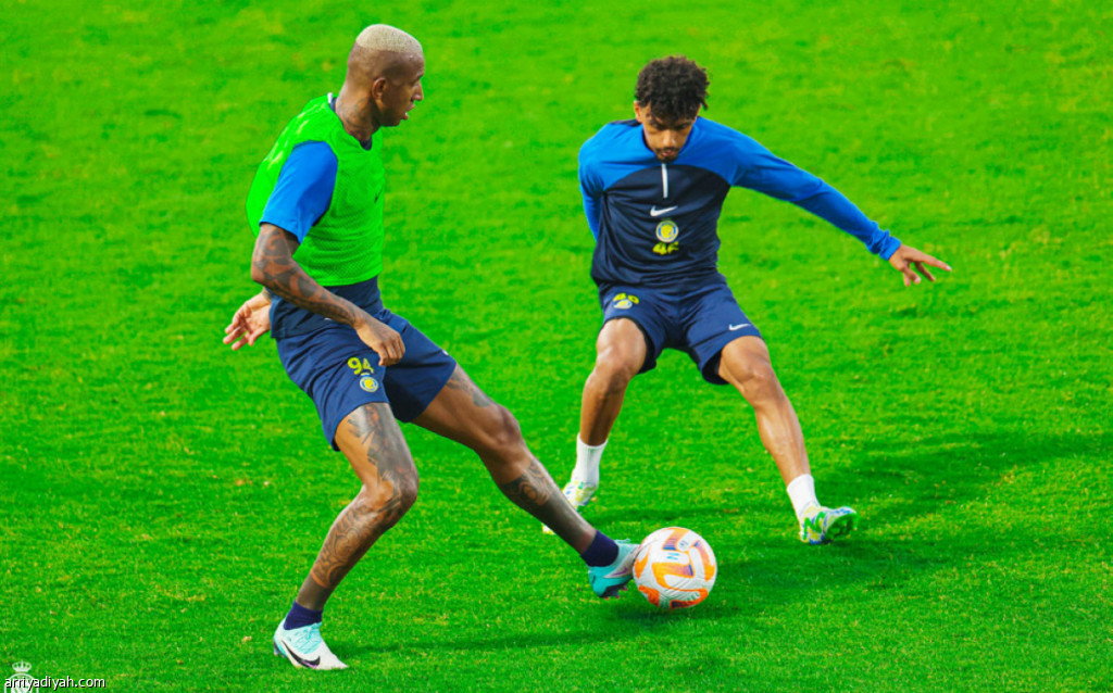 صورة التقطت أمس للبرازيلي أندرسون تاليسكا، مهاجم النصر، يسيطر على الكرة في التدريب الجماعي وسط ضغط عبد العزيز العليوة، لاعب الوسط (المركز الإعلامي ـ النصر)