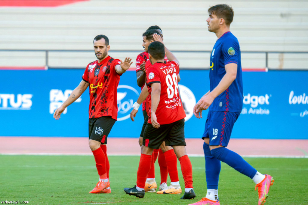 صورة التقطت أمس للاعبي الرياض يحتفلون بأحد أهدافهم في مرمى أبها (المركز الإعلامي ـ الرياض)