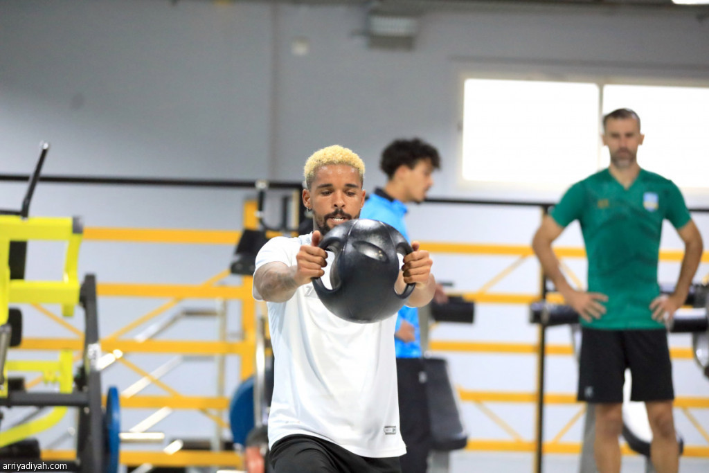 صورة التقطت أمس للرأس الأخضري إلتون سواريز لاعب فريق العين يحمل أوزانًا خلال الحصة اللياقية (المركز الإعلامي ـ العين)