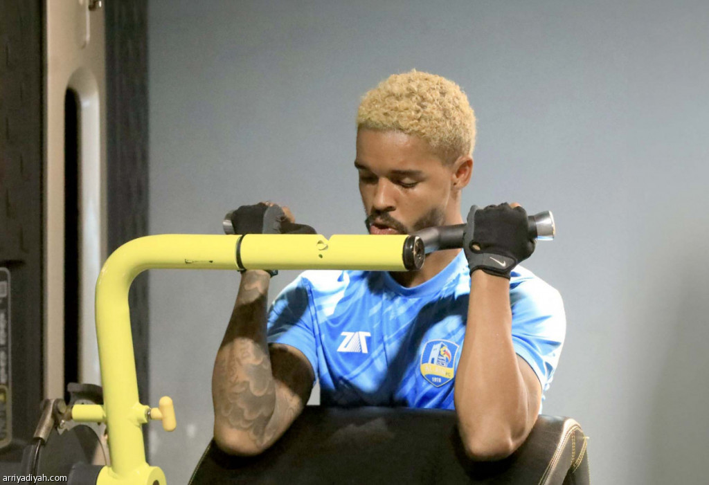 صورة التقطت أمس الأول للرأس الأخضري إلتون سواريز لاعب فريق العين الأول لكرة القدم يؤدي تمارين لياقية في الصالة (المركز الإعلامي ـ العين)