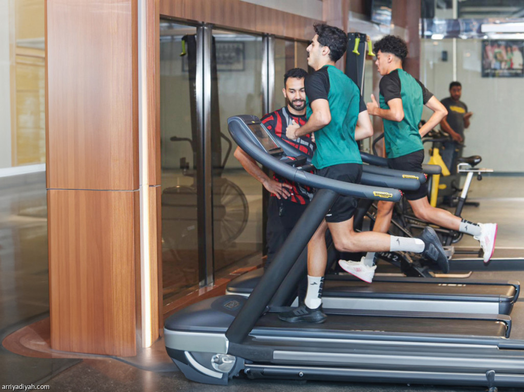 صورة التقطت أمس لسعد الموسى ومشعل العلالي لاعبي فريق الاتفاق الأول لكرة القدم يؤديان تمارين لياقية في الصالة الرياضية (المركز الإعلامي ـ الاتفاق)