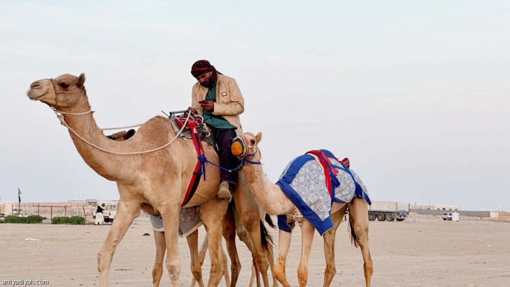 صورة التقطت أمس لمضمر يقود مطاياه ويتصفح هاتفه النقال في طريقه إلى ميدان السيح استعدادًا للمشاركة في منافسات كأس وزارة الرياضة للهجن(المركز الإعلامي ـ ميدان السيح)