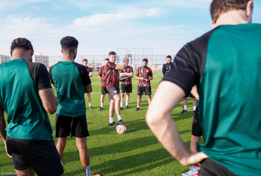 صورة التقطت أمس للإنجليزي ستيفن جيرارد، مدرب فريق الاتفاق الأول لكرة القدم، يوجِّه اللاعبين قبل انطلاق التدريبات (المركز الإعلامي ـ الاتفاق)