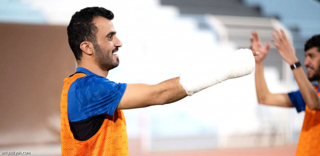 صورة التقطت أمس لحمد آل منصور، ظهير الأخدود، مضمدًا ساعده بجبيرة خلال التدريبات (المركز الإعلامي ـ الأخدود)