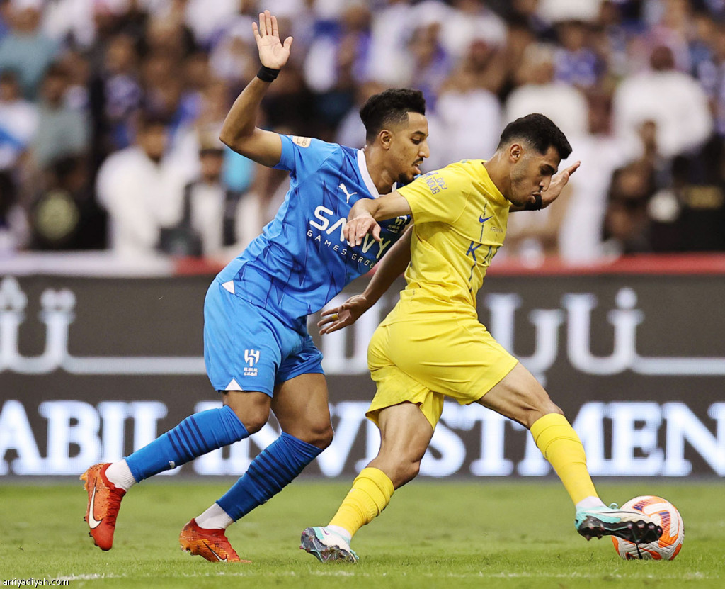 صورة التقطت، أمس، لسلطان الغنام ظهير النصر بحوزته الكرة وسط مضايقة سالم الدوسري جناح الهلال تصوير: سعد العنزي
