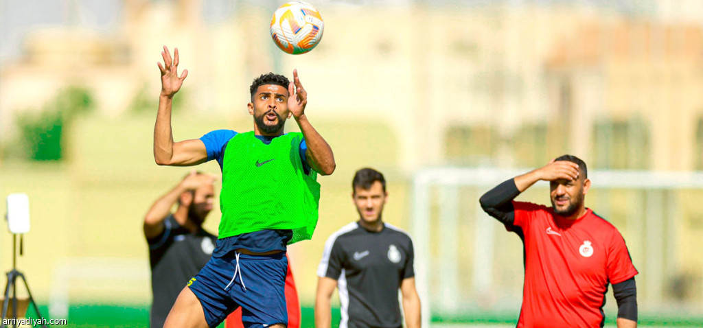 صورة التقطت أمس للمدافع عبد الإله العمري يسدِّد كرةً برأسه خلال الحصة التدريبية للنصر (المركز الإعلامي ـ النصر)