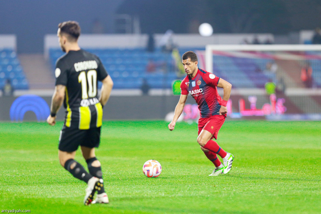 صورة التقطت أمس الأول للمصري طارق حامد، لاعب فريق ضمك، يستعدُّ لتمرير الكرة خلال مواجهة الاتحاد (المركز الإعلامي ـ ضمك)