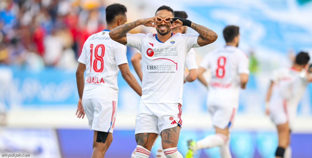 صورة التقطت أمس لكايو فيرنانديز، جناح الشارقة، يحتفل بهدفه في شباك حتا من ركلة جزاء (المركز الإعلامي ـ الشارقة)