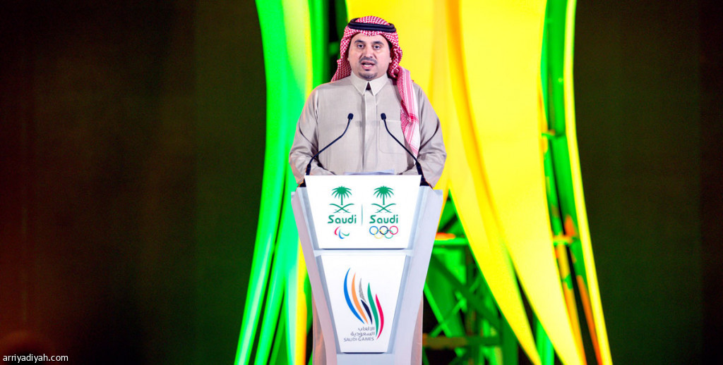 صورة التقطت أمس لفهد بن جلوي، نائب رئيس اللجنة الأولمبية والبارالمبية السعودية ومدير دورة الألعاب السعودية، متحدثًا خلال حفل ختام الدورة(المركز الإعلامي ـ الألعاب السعودية)