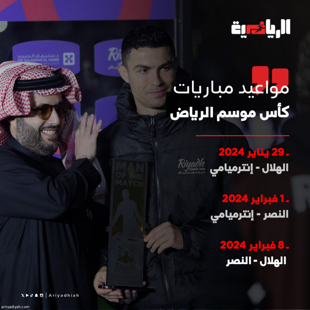 ومن المقرر أن يصل فريق إنتر ميامي الأمريكي إلى العاصمة في يناير المقبل، ليخوض أولى مبارياته في كأس موسم الرياض ضد كل من الهلال والنصر، حيث سيواجه إنتر ميامي، حامل لقب كأس الدوري الأمريكي لكرة القدم في أولى مبارياته في البطولة بملعب المملكة أرينا (يوم الاثنين 29 يناير)، الهلال الذي يتربع حاليا على صدارة دوري روشن السعودي، وفي مباراته الثانية (يوم الخميس 1 فبراير)، سيواجه إنتر ميامي نادي النصر في لقاء أطلق عليه “The Last Dance"، حيث سيتواجه نجوم كرة القدم الأسطوريان كريستيانو رونالدو من فريق النصر، وليونيل ميسي من فريق إنتر ميامي وجها لوجه على أرض مرة أخرى بعد آخر لقاء جمع بينهما في كأس وتختتم فعاليات البطولة (يوم الخميس 8 فبراير) المقبل بديربي الرياض بين الهلال والنصر، حيث سيتوج الفريق الذي يجمع أكبر عدد من النقاط بكأس البطولة.