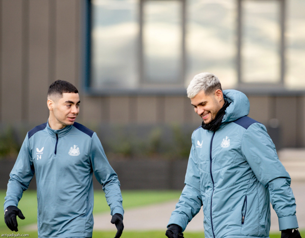 صورة التقطت أمس للبرازيلي برونو جيماريش والباراجوياني ميجيل ألميرون لاعبي فريق نيوكاسل لدى وصولهما إلى ملعب التدريبات (المركز الإعلامي ـ نيوكاسل)