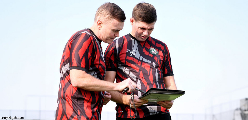 صورة التقطت أمس للإنجليزي ستيفن جيرارد، مدرب الاتفاق، يتشاور مع مساعده قبل بداية التدريبات (المركز الإعلامي ـ الاتفاق)