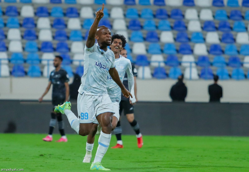 النيجيري سافيور جودوين لاعب فريق الأخدود الأول لكرة القدم، يحتفل بهدفه في شباك الشباب ( المركز الإعلامي- دوري روشن السعودي)