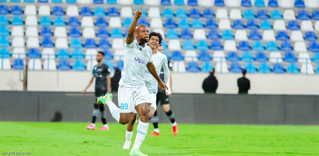 صورة التقطت أمس للنيجيري سافيور جودوين، مهاجم فريق الأخدود الأول لكرة القدم، يحتفل بعد تسجيل هدفٍ في مرمى الشباب.. ويظهر خلفه زميله حسين الزبداني (المركز الإعلامي - دوري روشن السعودي)