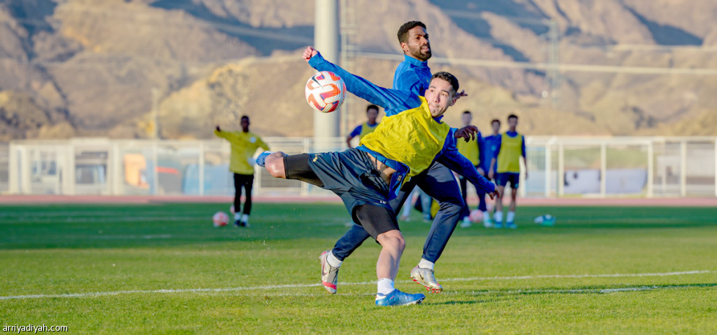 صورة التقطت أمس للكولومبي خوان بيدروزا لاعب فريق الأخدود يسدد الكرة من الوضع طائرًا أثناء التدريبات (المركز الإعلامي ـ الأخدود)