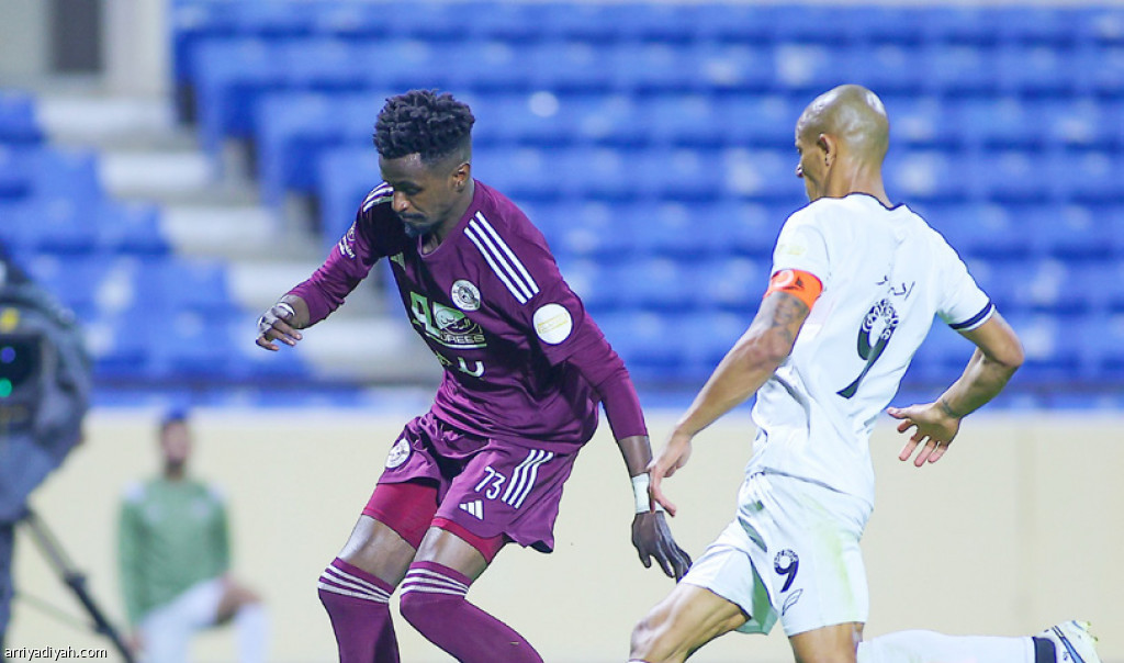 صورة التقطت أمس لحسن الحربي، لاعب فريق الفيصلي، يحاول إبعاد الكرة وسط مضايقة من البرازيلي أدريانو باردال لاعب هجر(المركز الإعلامي ـ دوري يلو)