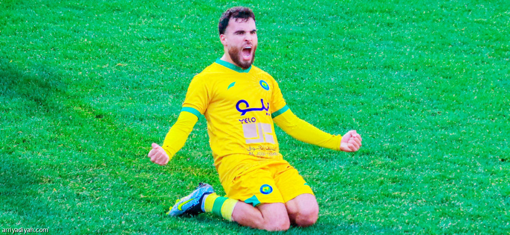 صورة التقطت أمس للمغربي منير العلوشي لاعب فريق العروبة الأول لكرة القدم بعد تسجيله هدف المباراة الوحيد أمام البكيرية (المركز الإعلامي ـ دوري يلو)