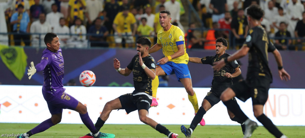 الأسطورة البرتغالي كريستيانو رونالدو قائد فريق النصر يسدد كرة وسط مجموعة من لاعبي التعاون وحارس المرمى (أرشيفية)