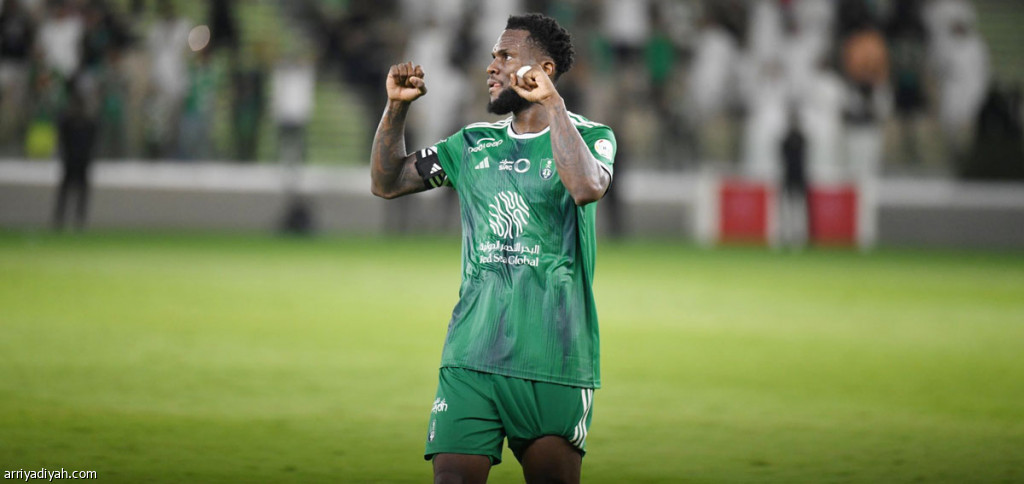 صورة التقطت أمس للإيفواري فرانك كيسيه، لاعب وسط فريق الأهلي الأول لكرة القدم، يرفع يديه محتفلًا بالانتصار فور انتهاء المواجهة مع الخليج ضمن الجولة الـ 19 (المركز الإعلامي ـ دوري روشن السعودي)