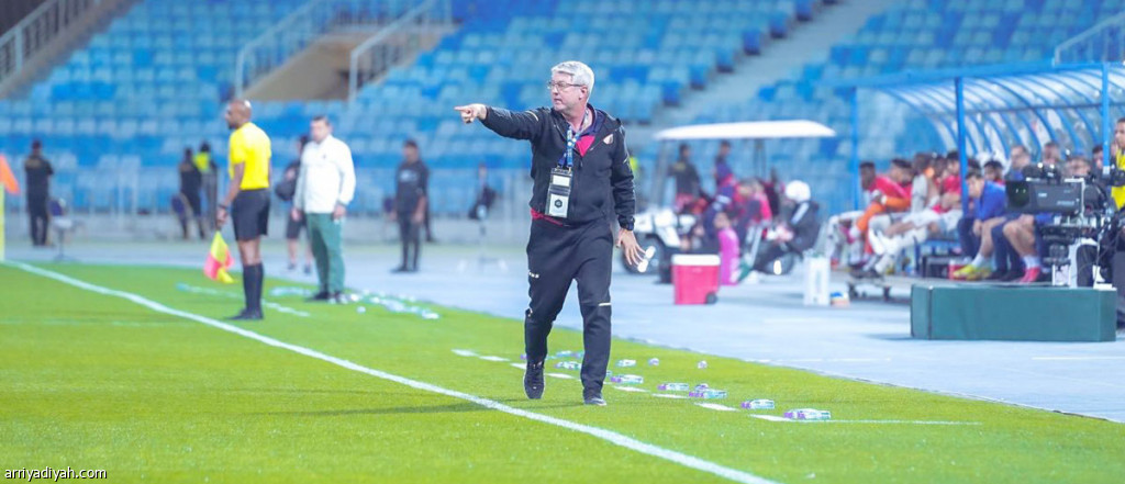 صورة التقطت أمس الأول للبرازيلي أودير هيلمان، مدرب الرياض، يوجّه لاعبيه خلال مواجهة ضمك التي فاز فيها الرياض بهدف