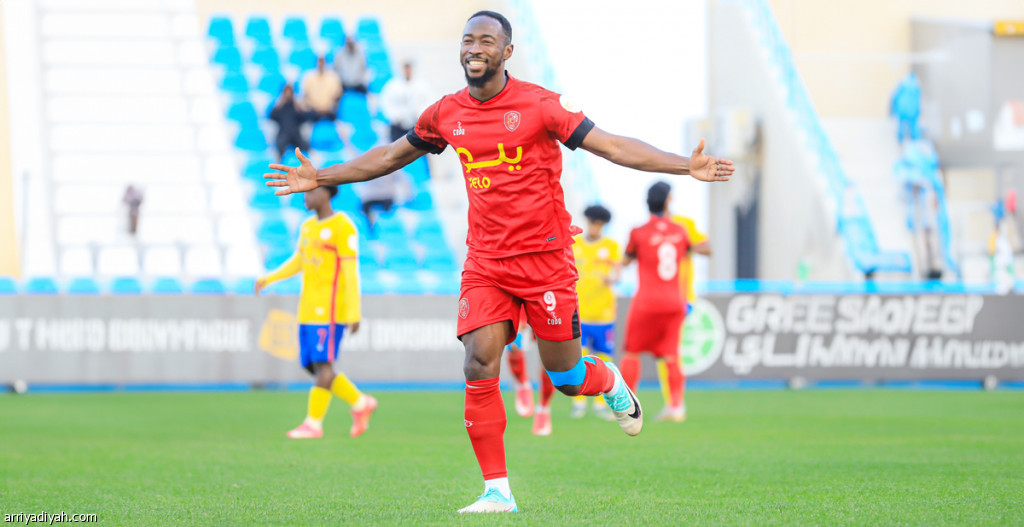 صورة التقطت أمس للغاني سادات كريم، لاعب فريق القيصومة، أثناء احتفاله بتسجيل الهدف الأول (المركز الإعلامي ـ دوري يلو)