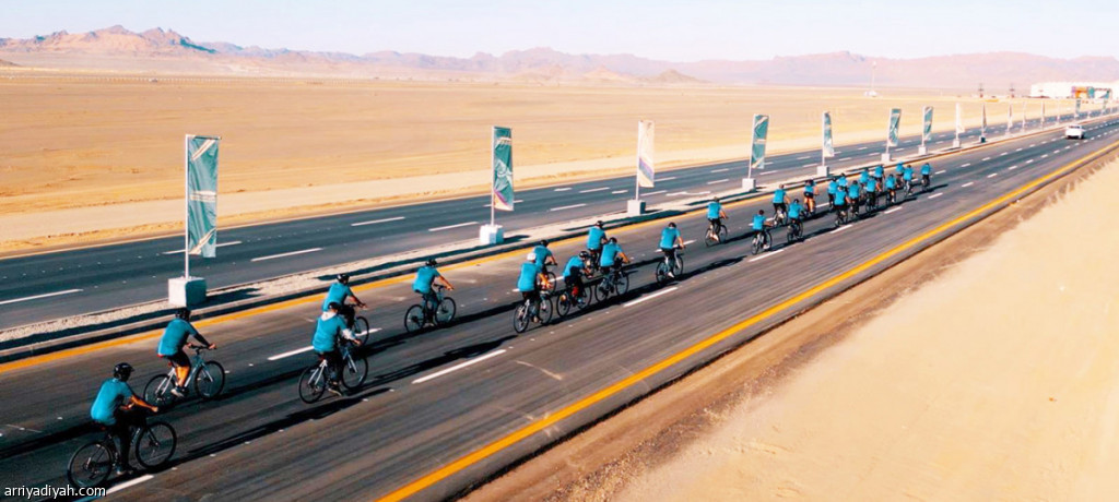صورة التقطت أمس لدرَّاجي نادي العلا خلال توجههم إلى مقر كأس العلا للصقور (واس)