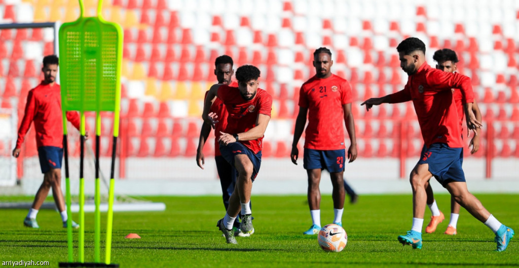لاعبو فريق ضمك الأول لكرة القدم ضمن الحصة التدريبية. (المركز الإعلامي - ضمك)