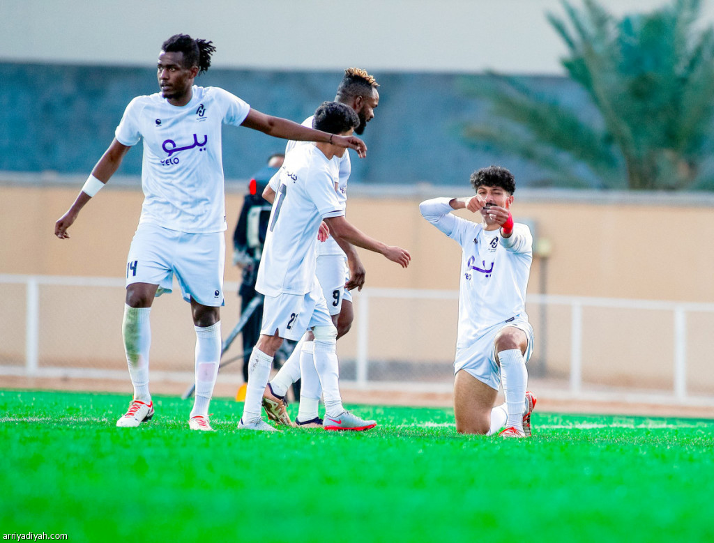 صورة التقطت أمس لحمود الشمري لاعب الجندل يحتفل مع زملائه بعد تسجيله الهدف الثاني في مرمى البكيرية (المركز الإعلامي ـ دوري يلو)