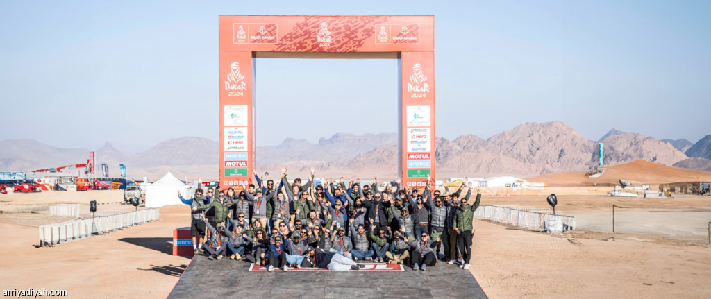 صورة التقطت أمس لفريق التنظيم بعد انتهاء جميع التجهيزات المتعلقة بالنسخة الخامسة لرالي داكار السعودية الذي ينطلق غدًا من محافظة العلا (المركز الإعلامي - داكار السعودية)